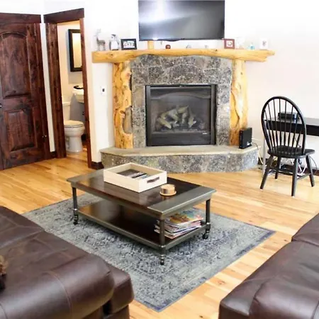 Accompanied by a stone fireplace, Pinecreek #E - 3 Bedroom - Pool And Hot Tub Access - Close To Town - Shuttle To Slopes also includes in-room amenities like ironing facilities. The property comes with a bathroom with a bath and a shower. A hair dryer are included for added comfort.